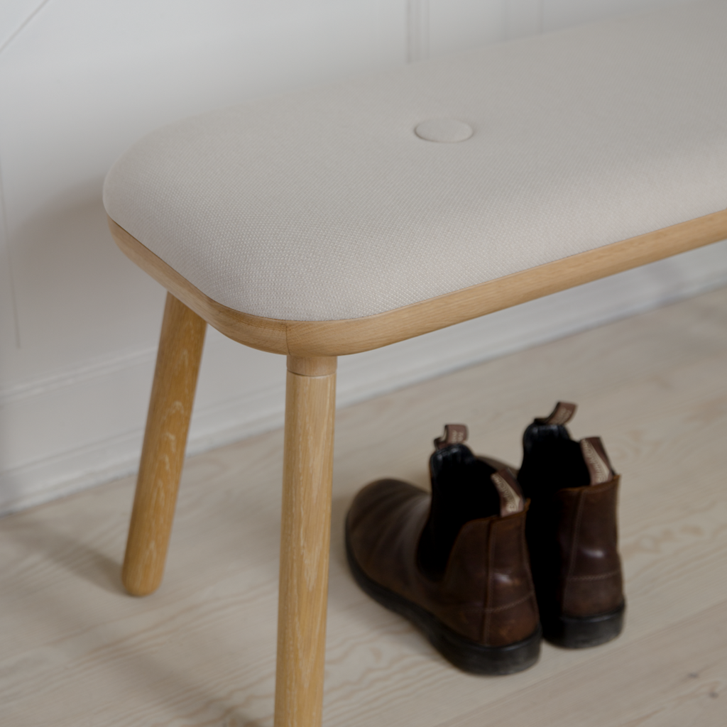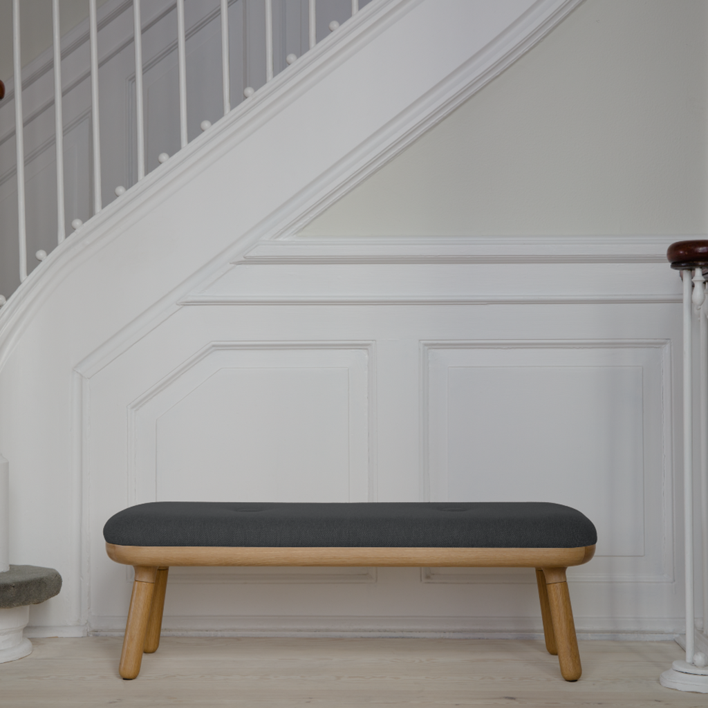 Bænken har en base af massivt egetræ og et polstret sæde, der fås i de fire standardfarver af det 100 % genanvendte Horizons-tekstil. Paff bench fås i low og tall - med korte eller lange ben - så den passer til både voksne og børn.