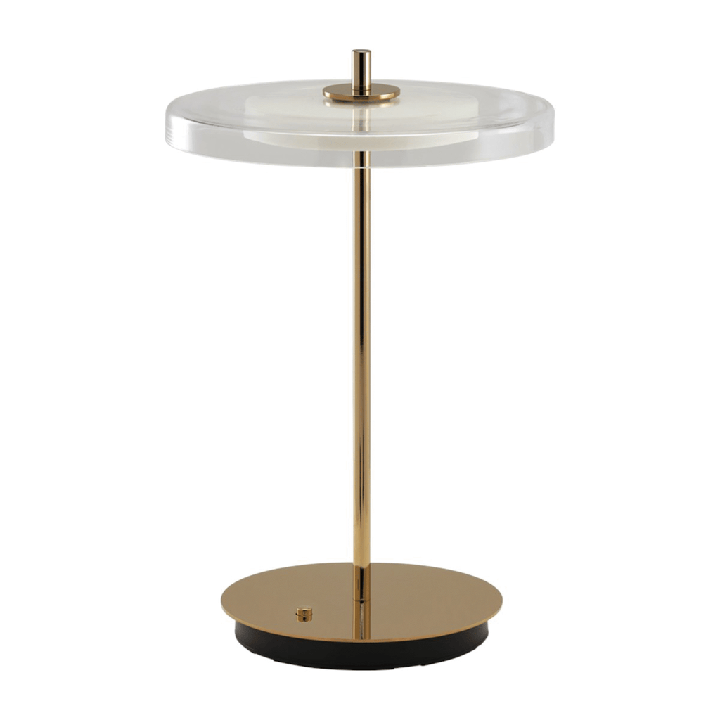 Blending cordless flexibility with contemporary elegance, the Asteria Move Glass adds a new lightness to the Asteria collection. Its transparent glass shade and sculptural diffuser create a soft, ambient glow across four brightness levels, while polished brass or steel accents complete the refined design. Portable and versatile, it brings atmosphere and sophistication to any space.