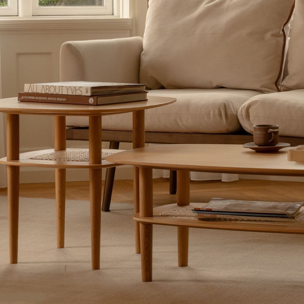 Rooted in the essence of Scandinavian living, the Together side table combines timeless design with everyday functionality. With its refined oak frame, airy Venetian cane shelf, and softly rounded corners, it brings warmth, elegance, and a welcoming presence to any space - from compact apartments to spacious lounges.