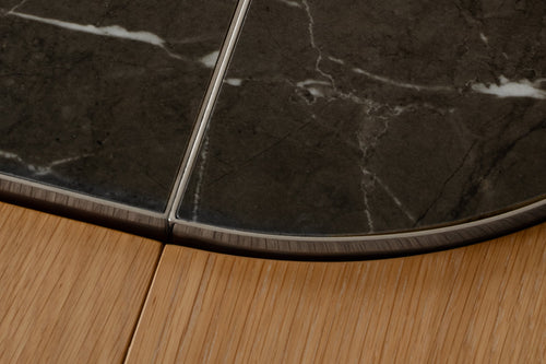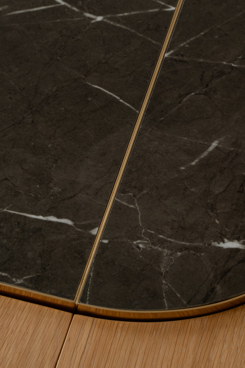 Ceramic stone is a natural, non-porous material valued for its durability, subtle texture, and timeless aesthetic. Each tabletop is unique, with natural variations in colour and veining that highlight its origin. The surface is highly resistant to heat, scratches, and stains, making it ideal for everyday use, while retaining its refined appearance over time.